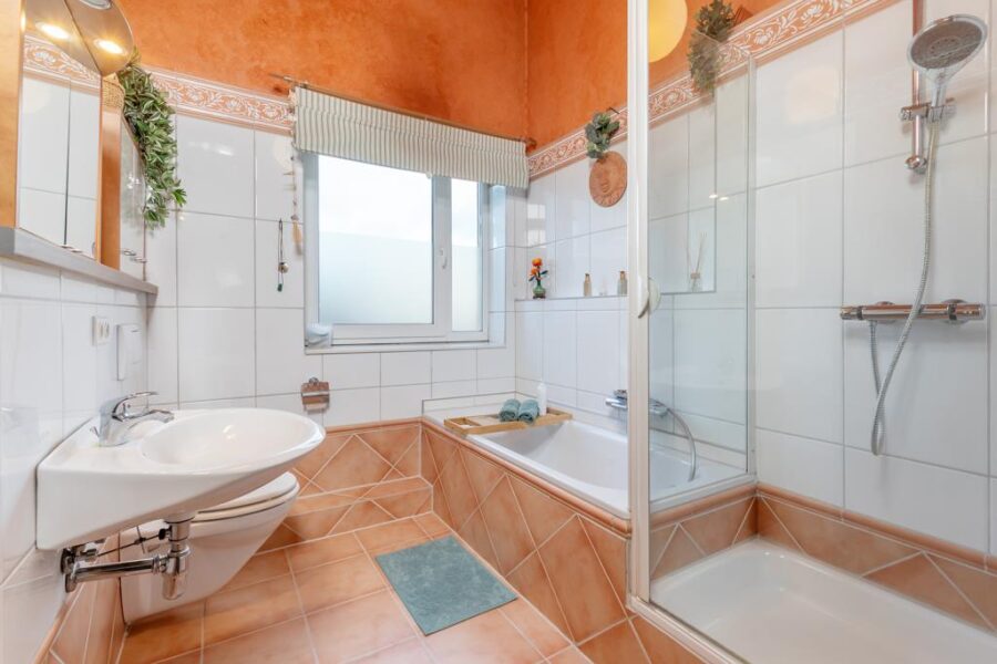 Das großzügige Vollbad besticht durch terracottafarbene Bodenfliesen und helle Wandfliesen, akzentuiert von einer stilvollen Ornamentfliesenleiste. Es ist mit einer Badewanne, einer separaten Dusche, einem Waschbecken sowie einem WC ausgestattet. Ein großes Fenster sorgt für ideale Belüftung und natürliche Lichtverhältnisse.