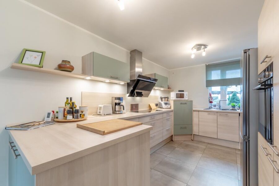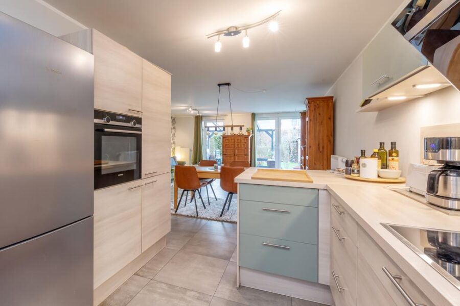 Zu Ihrer Rechten befindet sich die offene Küche, welche nicht nur durch ihre moderne Ausstattung überzeugt, sondern auch durch den direkten Blick in das Herzstück der Immobilie – den geräumigen Wohn- und Essbereich.