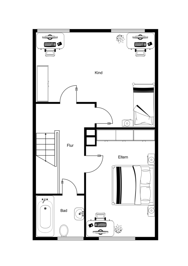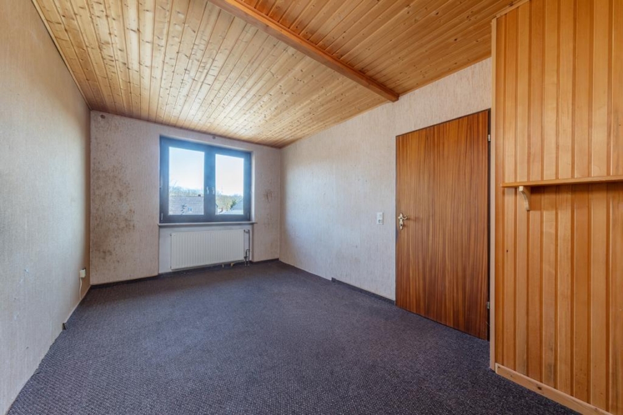 Im Obergeschoss befinden sich zwei Schlafzimmer, die flexibel als Kinder-, Arbeits- oder Gästezimmer genutzt werden können. Der Grundriss wurde in der Vergangenheit bereits an die Bedürfnisse der Bewohner angepasst und eine Trennwand entfernt, um den Raum zu vergrößern. Sollte ein weiteres Zimmer benötigt werden, ließe sich dies durch das erneute Einsetzen der Zwischenwand problemlos erreichen. Das Badezimmer ist funktional ausgestattet, bedarf jedoch einer Sanierung, um modernen Ansprüchen gerecht zu werden.
