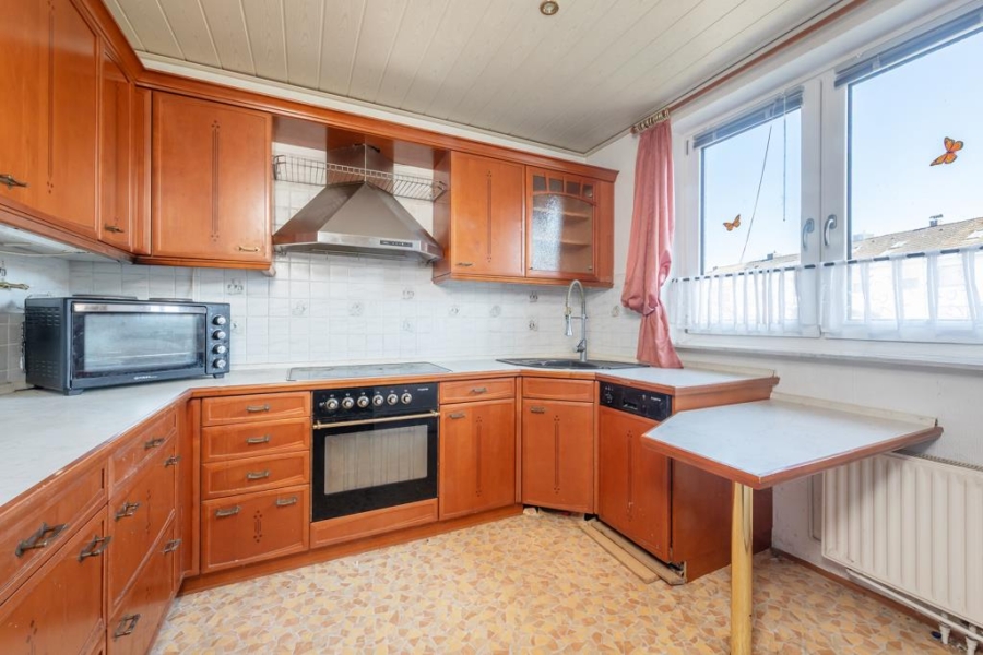 Die angrenzende Küche bietet ausreichend Platz für kulinarische Entfaltung und ist aktuell mit einer funktionalen Einbauküche aus Holz ausgestattet.