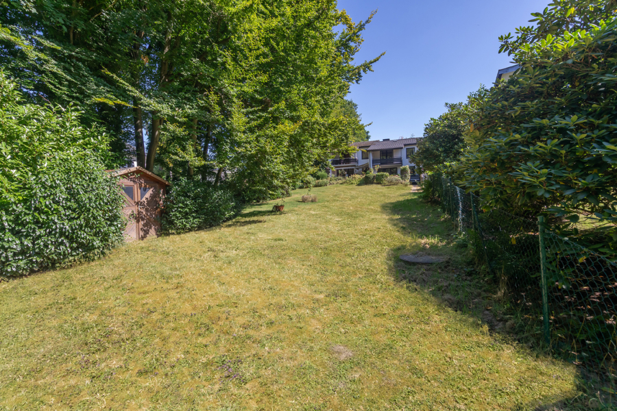 Der dem Objekt zugewiesene Grundstücksteil überzeugt mit einer herrlichen Grünfläche, die abschüssig vom Haus verläuft. Das Grundstück ist im Bereich der Terrasse sowie im Vorgarten mit Büschen und kleineren Pflanzen eingefasst und sehr pflegeleicht angelegt.