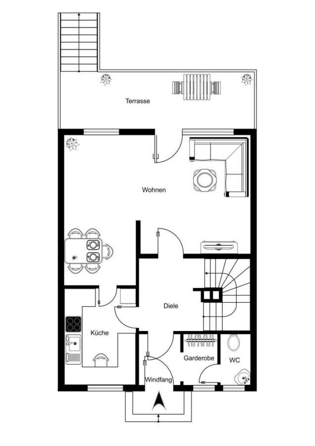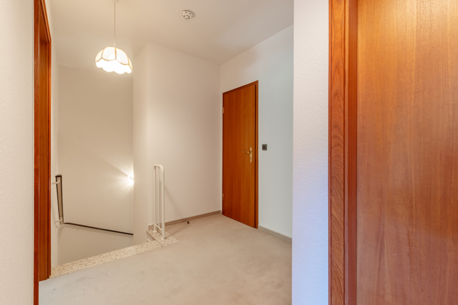 Im Erdgeschoss empfängt Sie ein praktischer Windfang mit angrenzender Garderobe und einem Gäste-WC. Von hier aus gelangen Sie in die Diele, die den zentralen Zugang zu allen Räumlichkeiten sowie dem Kellergeschoss ermöglicht.