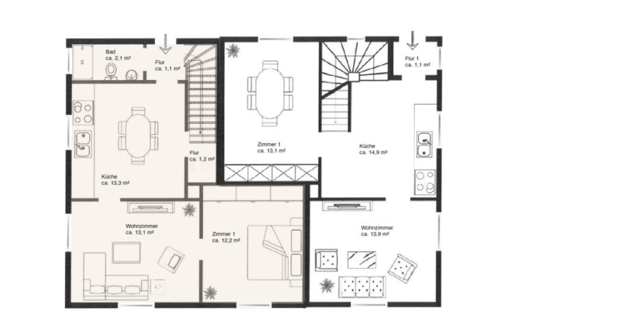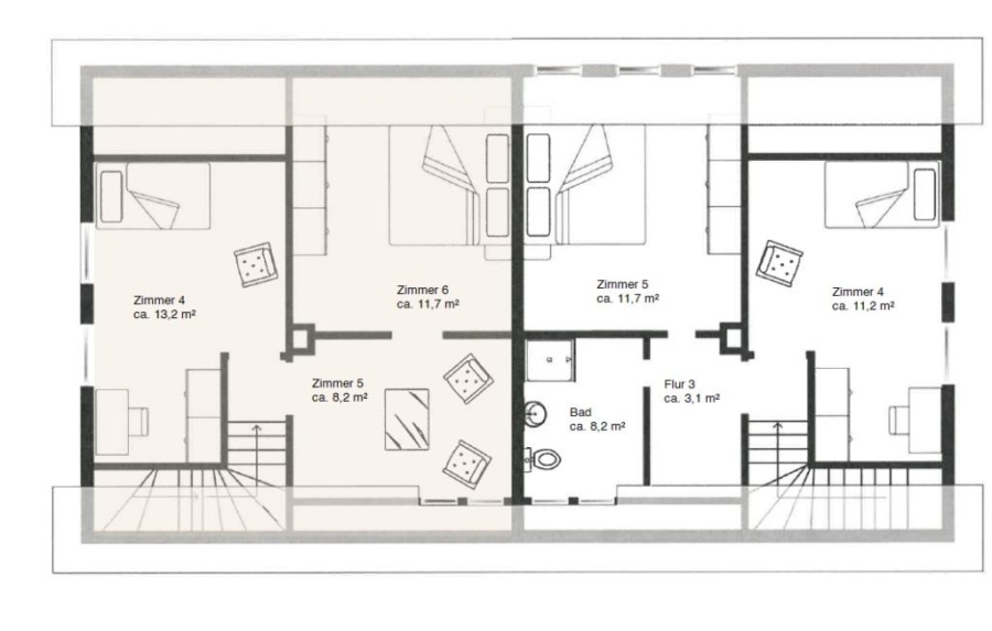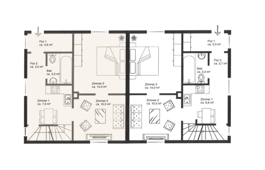 • Zimmeranzahl: 5 bis 6 pro Haushälfte inkl. Wohnküchen