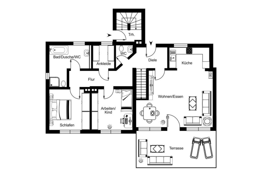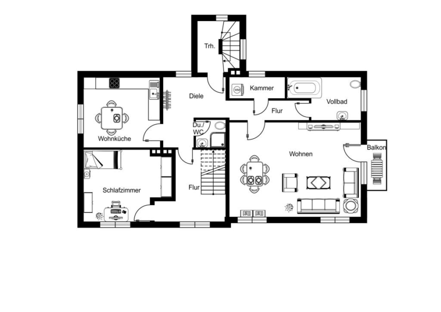 Die Obergeschosswohnung umfasst ca. 103 m² sowie eine zusätzliche wohnähnliche Nutzfläche von ca. 39 m² im ausgebauten Dachgeschoss. Das Obergeschoss bietet ein Wohn- und Esszimmer mit Balkon, eine geräumige Wohnküche, ein Schlafzimmer, ein Vollbad mit Badewanne und ein Duschbad mit WC. Den Abschluss macht ein Abstellraum mit den Anschlüssen für Waschmaschine und Trockner.