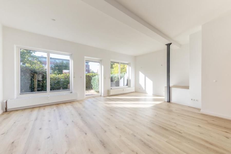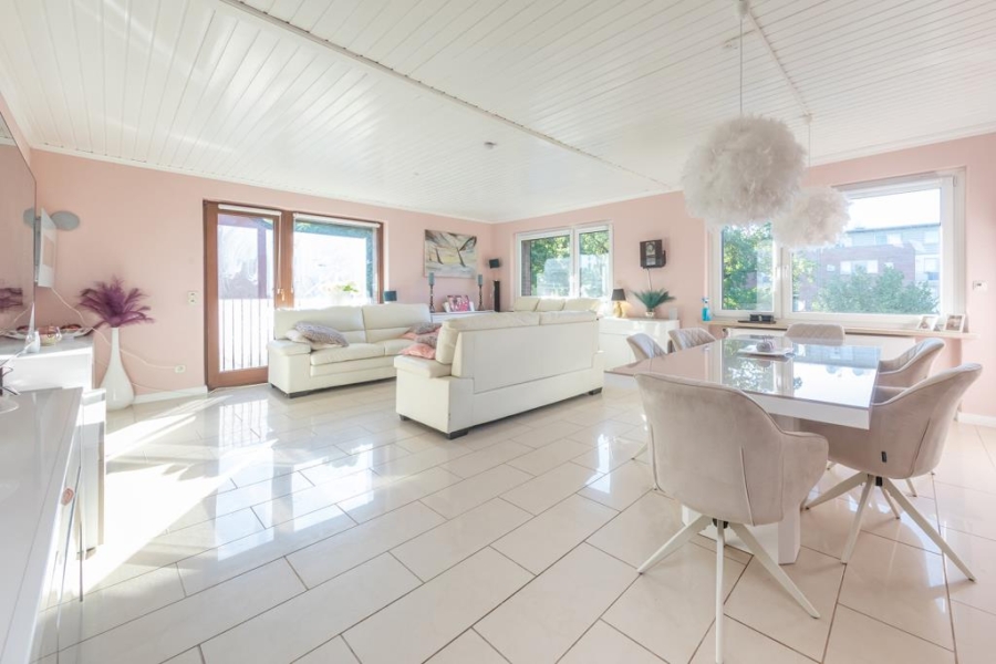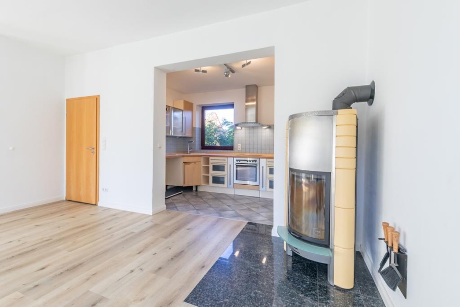 Die aktuell freistehende Erdgeschosswohnung erstreckt sich über ca. 108 m² und bietet eine durchdachte Raumaufteilung, die sich ideal für Familien eignet. Sie verfügt über einen geräumigen Wohn- und Essbereich, welcher durch einen einladenden Kamin eine besondere Atmosphäre erhält und den direkten Zugang zur Terrasse ermöglicht. Die Küche integriert sich charmant in das kommunikative Zentrum der Wohnung und verfügt über eine angenehme Größe.