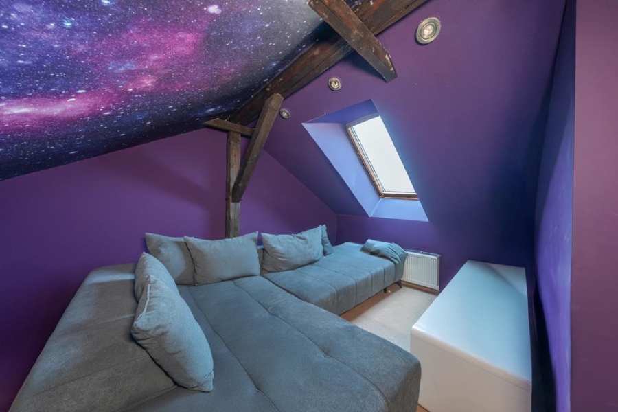 Über eine separate Treppe gelangen Sie in das Dachgeschoss, wo zwei weitere Räume zur Verfügung stehen. Diese können ganz nach Bedarf genutzt werden – beispielsweise als Hobby- oder Arbeitszimmer. Besonders für Kinder bieten die Räumlichkeiten im Dachgeschoss jedoch ideale Voraussetzungen, um einen eigenen Rückzugsort zu haben, welcher genügend Raum für Spiel, Kreativität und Ruhe schafft und gleichzeitig ein Stück Unabhängigkeit ermöglicht.