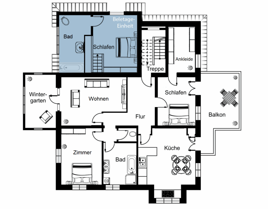 Die Beletage Wohnung verfügt über einen separaten Eingang und erstreckt sich über ca. 224 m² Wohnfläche mit insgesamt fünf Zimmern, einem Wintergarten sowie einem sonnigen Balkon. Die Beletage beherbergt die repräsentativen Räume, welche sich bis heute in einem hervorragenden Zustand befinden und charakteristische Elemente aufweisen, beispielsweise gut erhaltene Dielenböden, Türzargen, Stuck und Kamine. Diese verleihen den Räumen eine unverwechselbare Atmosphäre. Das ursprüngliche Treppenhaus der Villa wurde entfernt und die Decken geschlossen, was die Beletage großzügig um ein Schlafzimmer mit Bad en Suite erweitert hat.