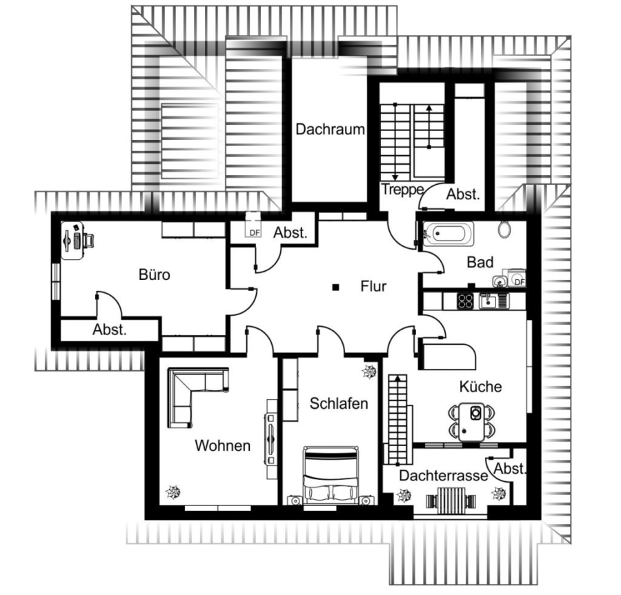 Die Einheit im Dachgeschoss ist mit drei Zimmern und einer Wohnfläche von ca. 102 m² versehen. Über die nach Süden ausgerichtete Loggia der Wohnung erreichen Sie den Spitzboden, der ideal als zusätzlicher Abstellraum genutzt werden kann.