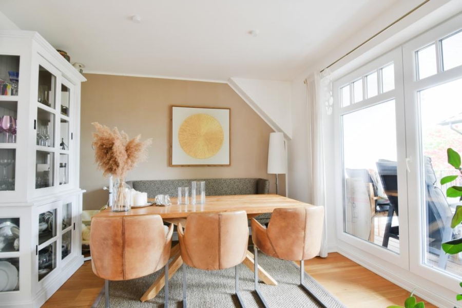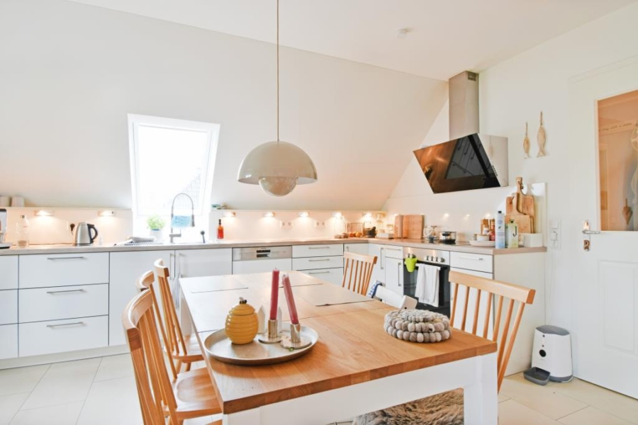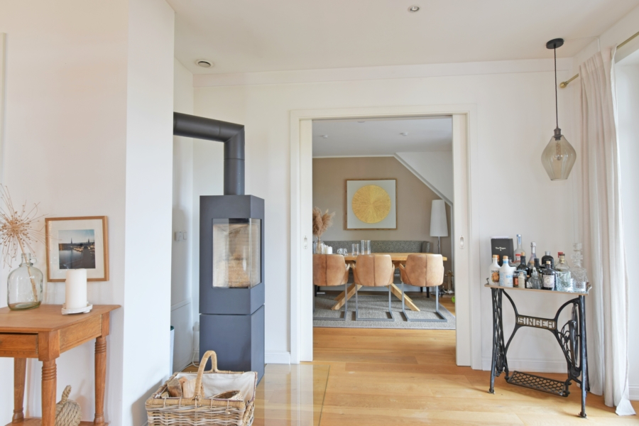 Von der Diele gelangen Sie direkt in die Wohnküche. Diese ist mit einer modernen Einbauküche sowie hochwertigen E-Geräten namhafter Hersteller ausgestattet und bietet durch die zahlreichen Unterschränke genügend Platz für jegliche Küchenutensilien. Dank der großzügigen Raumaufteilung bleibt hier ausreichend Platz für einen Esstisch. Eine praktische Schiebetür verbindet die Küche mit dem Wohnbereich und schafft bei Bedarf eine optimale Trennung.