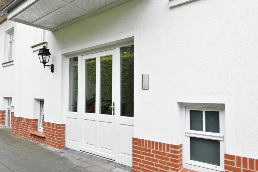 Die Außenfassade präsentiert sich weiß verputzt mit roten Klinkersteinen als Details, dazu passend korrespondieren die weißen Kunststofffenster, welche selbstverständlich dreifach-isolierverglast sind.