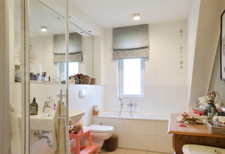 Rechter Hand befindet sich das Gäste-Duschbad, welches mit weißen Sanitärobjekten ausgestattet ist und besonders durch die Dusche sowie ein Fenster punktet. Hier wurden schlichte, sandfarbene Boden- und Wandfliesen verlegt.