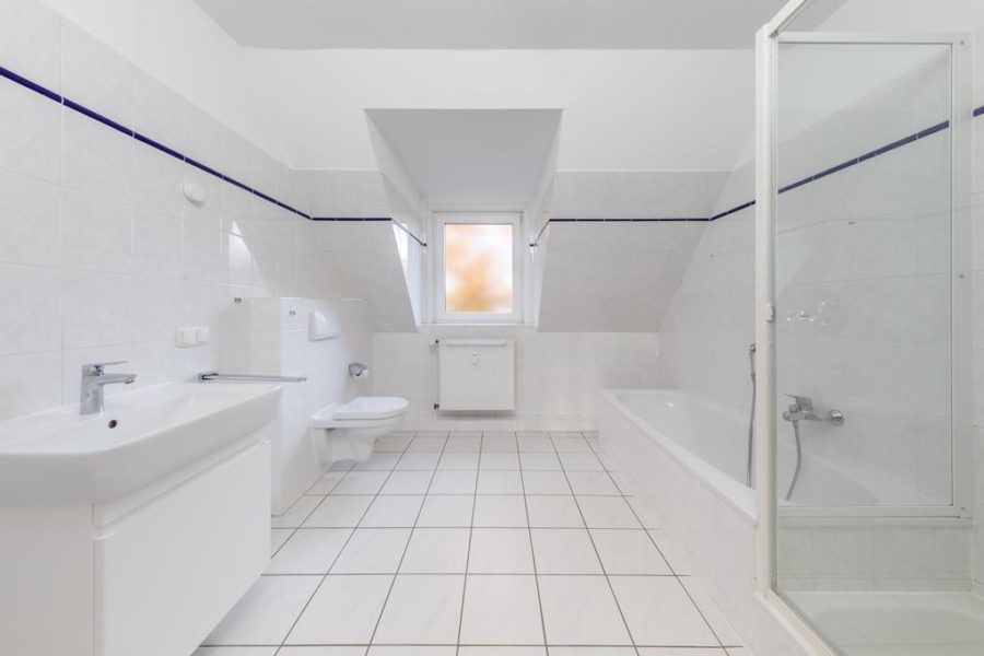 Das hell geflieste Badezimmer weiß mit einer Badewanne, einer separaten Dusche, einem Waschbecken und einem WC zu überzeugen. Ein Fenster sorgt zudem für optimale Belüftung.