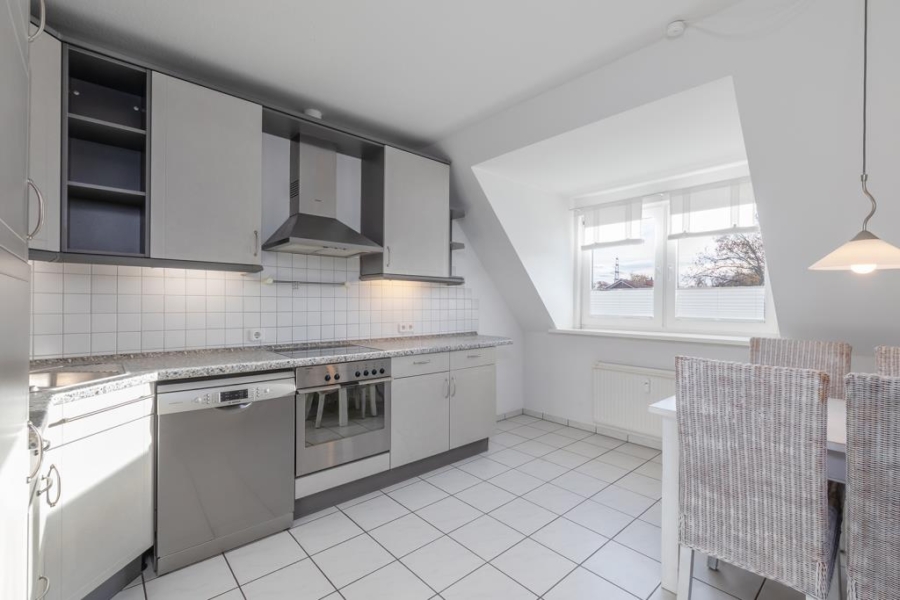 Angrenzend befindet sich die Küche, welche mit einer Einbauküche mitsamt Backofen, Herd, Geschirrspüler sowie einer Kühl-/ Gefrierkombination ausgestattet ist. Hier lässt sich zudem eine kleine Essecke einrichten.