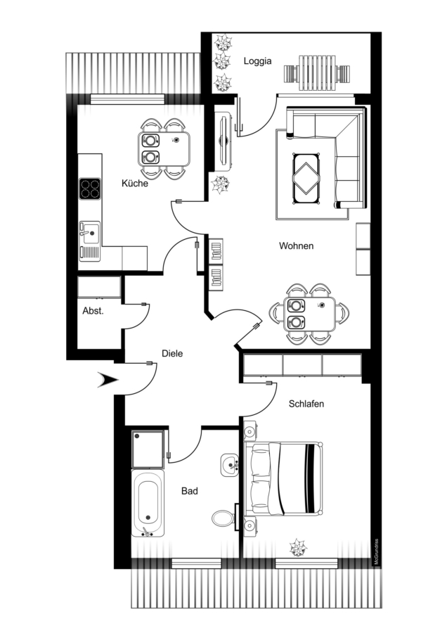 Beim Betreten der Wohnung werden Sie von einem einladenden Flurbereich in Empfang genommen, von dem alle Räumlichkeiten zentral begehbar sind.