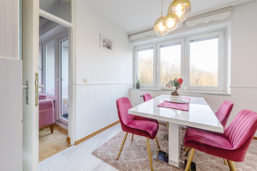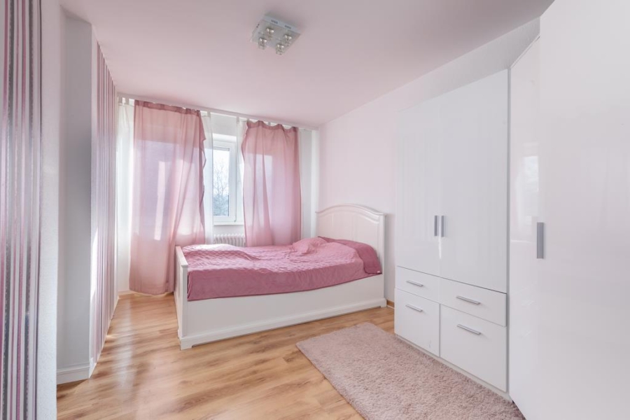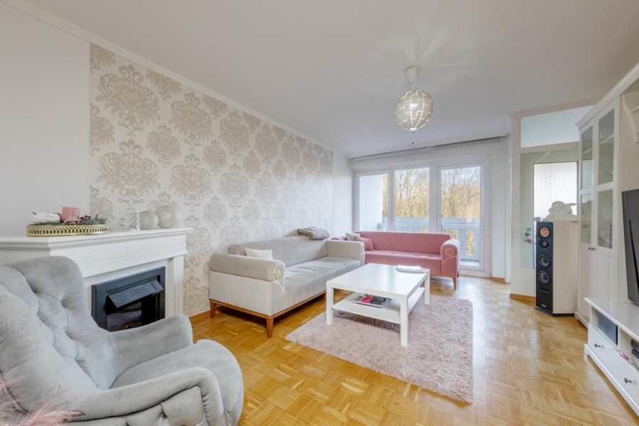 Das geräumige Wohnzimmer bildet den Mittelpunkt der Wohnung und bietet dank großer Fensterflächen eine angenehme, lichtdurchflutete Atmosphäre. Von hier aus gelangen Sie auf die gemütliche Loggia, die einen schönen Blick ins Grüne bietet und zum Entspannen im Freien einlädt.