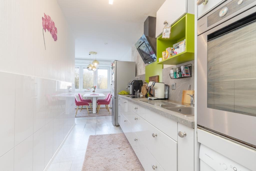 Die angrenzende Küche ist mit einer stilvollen Einbauküche ausgestattet und verfügt über alle notwendigen E-Geräte. Der charmante Essbereich mit Platz für einen großen Esstisch befindet sich direkt nebenan – ideal für gemeinsame Mahlzeiten mit Familie und Freunden.
