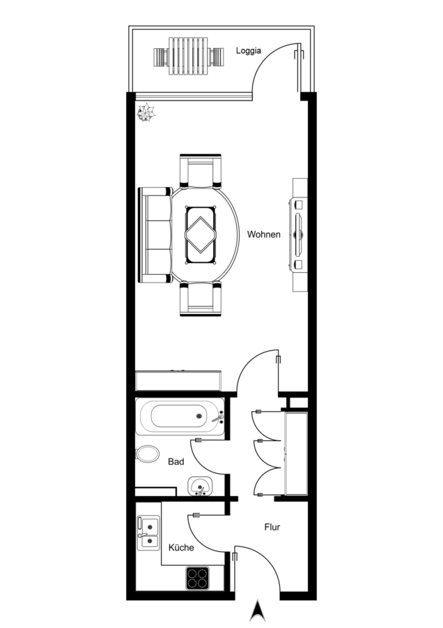 Das Zentrum der Wohnung bildet der gut geschnittene Wohn-/Schlafbereich, in welchen durch große Fenster ausreichend Tageslicht gelangt. Von hier haben Sie Zugang auf die straßenabgewandte Loggia, auf der sich gemütliche Stunden verbringen lassen.