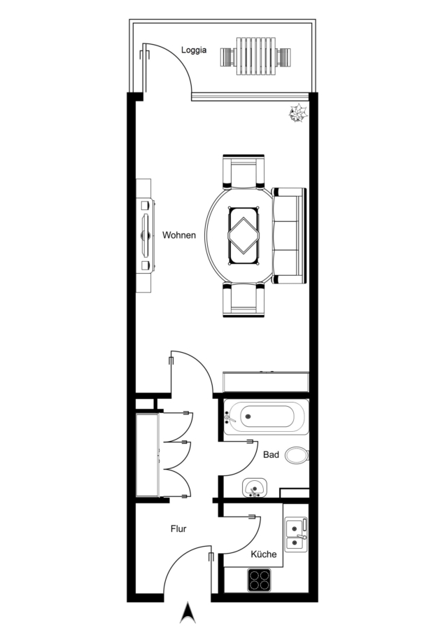 Das Zentrum der Wohnung bildet der gut geschnittene Wohn-/Schlafbereich, in welchen durch große Fenster ausreichend Tageslicht gelangt. Von hier haben Sie Zugang auf die straßenabgewandte Loggia, auf der sich gemütliche Stunden verbringen lassen.
