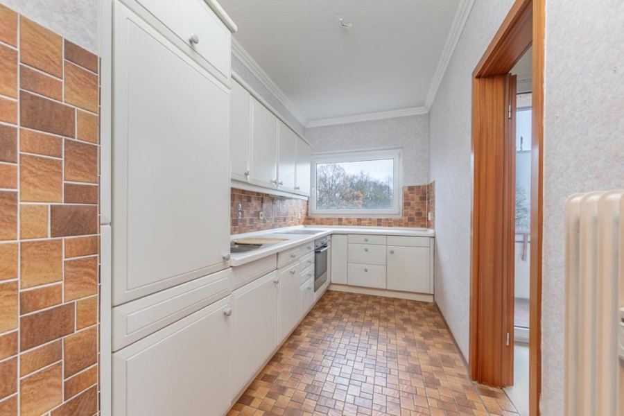 Die Küche ist separat gehalten und mit einer hellen Einbauküche ausgestattet. Die vorhandenen E-Geräte – darunter Herd, Backofen, Dunstabzug und Kühl-/Gefrierkombination – sind funktional und bieten eine solide Grundlage für den täglichen Gebrauch. Ein großes Fenster sorgt für Tageslicht und einen angenehmen Arbeitsbereich. Von dem anliegenden, halboffenen Essbereich aus gelangen Sie direkt auf den ersten Balkon mit östlicher Ausrichtung, ideal für ein Frühstück in der Morgensonne.