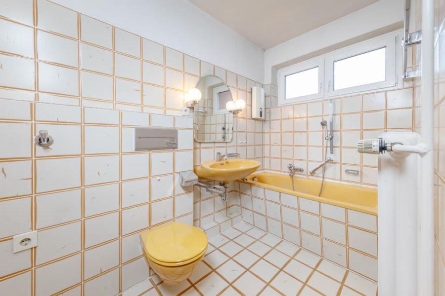 Das voll ausgestattete Badezimmer verfügt über eine Badewanne, ein Waschbecken, WC sowie über einen praktischen Waschmaschinenanschluss. Die gelb-beigen Sanitärobjekte vermitteln in Kombination mit den hellen Fliesen einen typisch klassischen Look der Bauzeit. Ein Fenster sorgt für angenehme Belichtung und natürliche Belüftung.