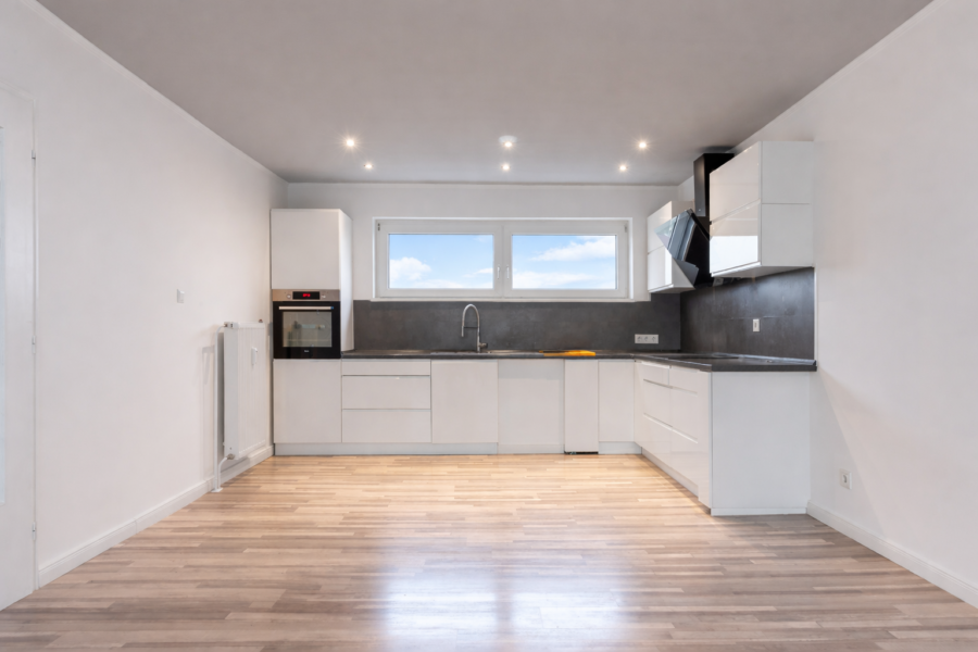 Geradezu gelangen Sie in den großzügigen Wohn- und Essbereich mit offener Küche, welcher das Herzstück der Wohnung bildet. Die moderne Einbauküche ist mit zeitlosen weißen Fronten, einer dunklen Arbeitsplatte sowie integrierten Elektrogeräten ausgestattet.
