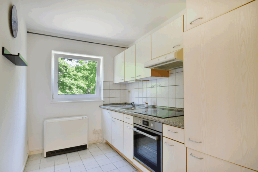 Die hell geflieste Küche ist mit einer zeitlosen, funktionalen Einbauküche aus einem jüngeren Baujahr ausgestattet.