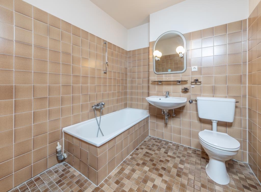Das Vollbad präsentiert sich geräumig und wird ergänzt durch ein separates Gäste-WC. Auch eine Waschmaschine findet hier bequem ihren Platz.
