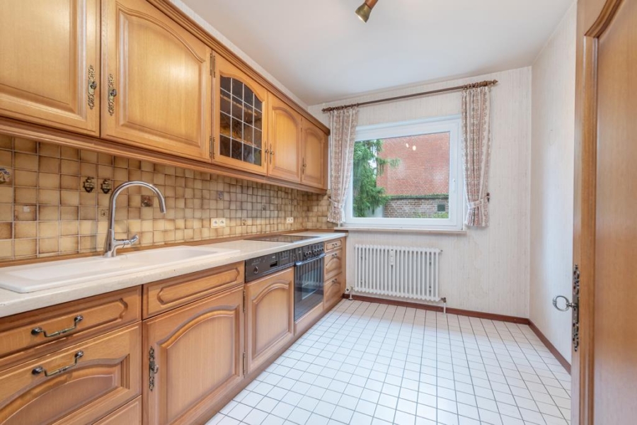 Die Küche überzeugt mit einer Einbauküche im charmanten Landhausstil. Sie ist ausgestattet mit einem Backofen samt Ceranfeld, einer Geschirrspülmaschine sowie genügend Platz für eine gemütliche Essecke.