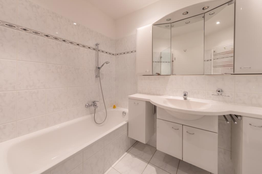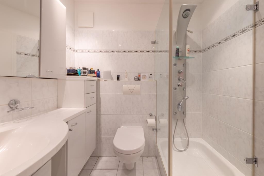 Das gepflegte Vollbad mit hellen Wand- und Bodenfliesen ist mit Badewanne und Dusche ausgestattet, während ein separates Gäste-WC zusätzlichen Komfort bietet.