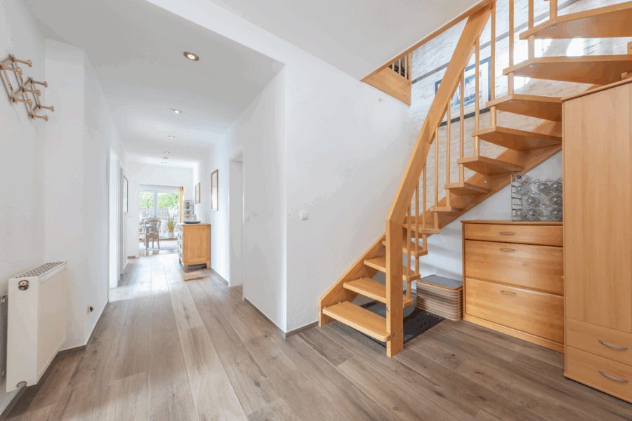Das helle Entrée mit Garderobenbereich öffnet den Blick in den offenen Wohnbereich, welcher mit bodentiefen Fensterelementen und einer südlich ausgerichteten Dachterrasse für sonnige Stunden sorgt.