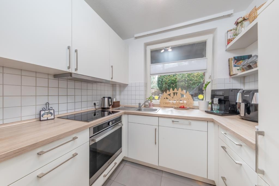 Beim Betreten der Wohnung gelangen Sie in den großzügigen Flur. Linker Hand befindet sich die hellgeflieste Einbauküche, welche mit allen notwendigen Elektrogeräten wie beispielsweise einem Backofen, einem Cerankochfeld und einem Kühlschrank ausgestattet ist. Hängeschränke bieten ausreichend Stauraum für Geschirr sowie Küchenutensilien. In der Küche wurden ebenfalls helle Bodenfliesen verlegt.