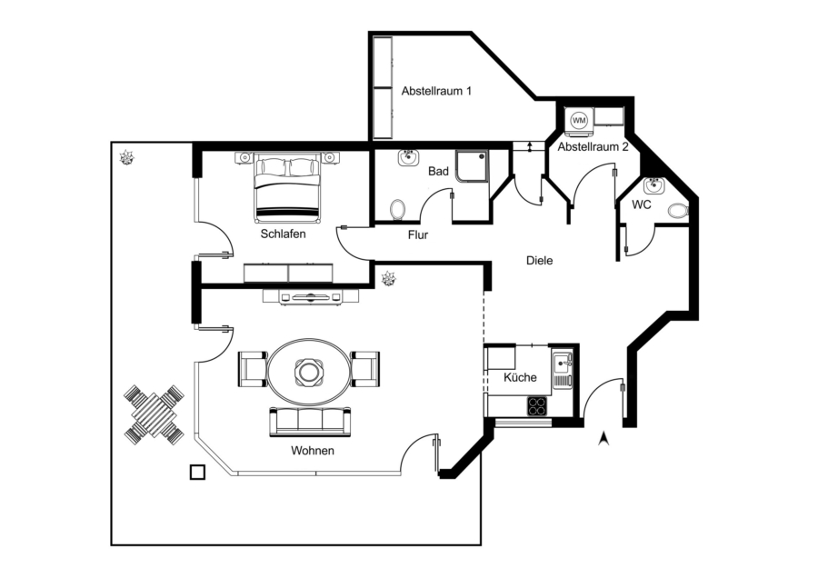 Angrenzend befinden sich zwei Abstellkammern, die zusätzlichen Stauraum zur Aufbewahrung bieten. In einem der Räume befinden sich die Anschlüsse für Waschmaschine und Trockner.