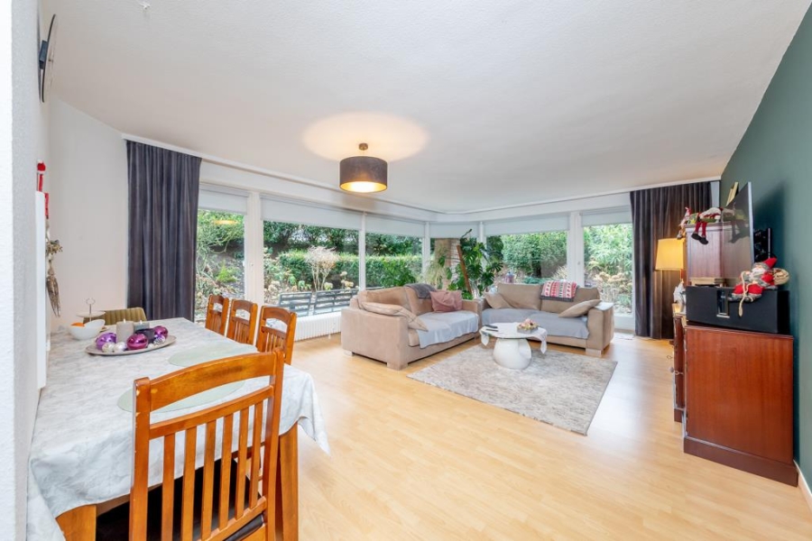 Das Herzstück der Wohnung bildet das geräumige Wohnzimmer mit Platz für eine gemütliche Sofalandschaft und einen Essbereich. Die bodentiefen Fenster sorgen für angenehme Lichverhältnisse. Von hier aus gelangt der Bewohner ebenfalls auf die sonnige, umlaufende Terrasse mit ausreichend Platz für gemütliche Grillabende.