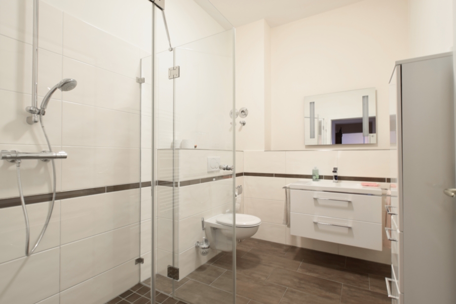Das Duschbad ist mit hellen Wandfliesen, dunklen Bodenfliesen und weißen Sanitärobjekten ausgestattet. Die bodengleiche Dusche mit Glasabtrennung sowie ein Handtuchheizkörper lassen keinerlei Wünsche offen.