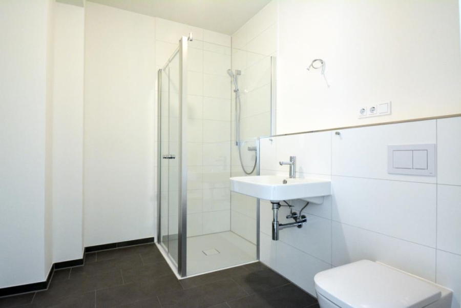 Rechter Hand befindet sich das Duschbad, ausgestattet mit weißen Sanitärobjekten, Handtuchheizkörper und einer modernen, ebenerdigen Dusche mitsamt Glasabtrennung.