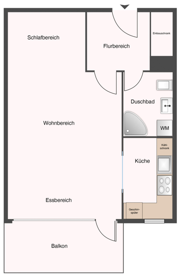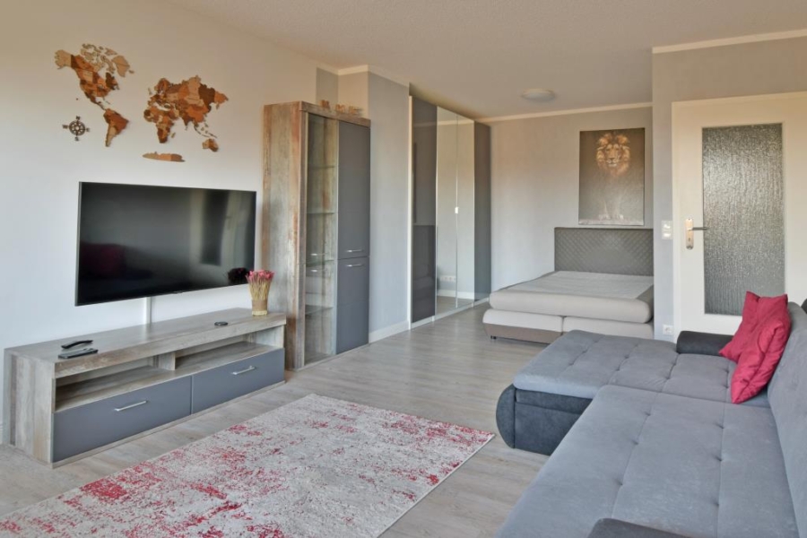 Ein kleiner Flur mit einem großen weißen Einbauschrank nimmt Sie in Ihrem neuen Zuhause in Empfang. Lichtdurchflutet präsentiert sich der offene Wohn- und Essbereich mit Zugang zum sonnigen Balkon. Direkt im Wohnzimmer befindet sich eine geschickt integrierte, gemütliche Schlafecke mit ausreichend Platz für ein großes Bett.