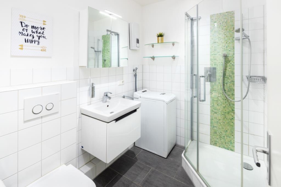 Das weiß geflieste, geschmackvolle Badezimmer verfügt über eine Glasduschkabine mit Eckeinstieg, ein Waschbecken und ein WC sowie eine praktische Handtuchheizung. Dort befindet sich ebenfalls der Anschluss für die Waschmaschine.