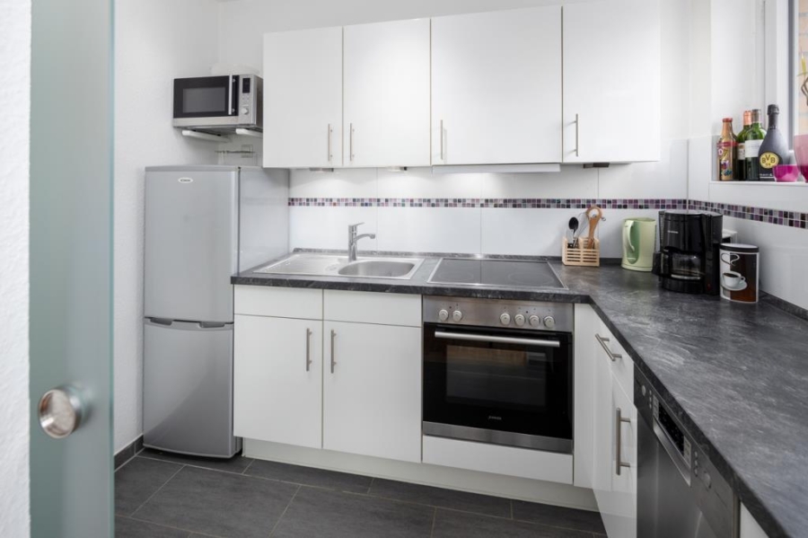 Die moderne Einbauküche mit weißen Hochglanzfronten und dunkler Arbeitsplatte ist mit allen notwendigen Elektrogeräten ausgestattet. Ein großzügiges Fenster sorgt für angenehme Lichtverhältnisse und eine gute Belüftung.