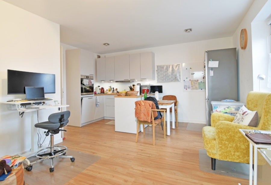 Besonders einladend ist der Wohn- und Essbereich, welcher durch eine offene Gestaltung, großzügige Deckenhöhen und viel natürliches Licht das Herzstück der Wohnung bildet. Die voll ausgestattete, offene Küche ist mit mattgrauen Fronten und einer Arbeitsplatte in Eichenholzoptik ein echter Hingucker. Alle notwendigen E-Geräte sind hierbei bereits vorhanden.