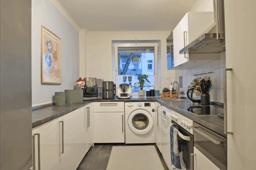 Direkt rechter Hand liegt die großzügige Küche, welche mit einer hellen Einbauküche inklusive allen notwendigen elektrischen Geräten ausgestattet ist. Hier befindet sich zudem der Anschluss für die Waschmaschine.