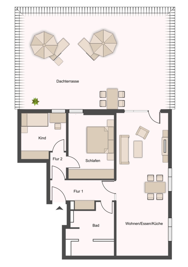 Der lichtdurchflutete Wohn-/Ess- und Kochbereich ist offen gestaltet und bietet viel Raum für eine gemütliche Einrichtung. Von hier aus gelangen Sie auf die großzügige Dachterrasse, auf der sich herrliche Stunden im Freien genießen lassen.