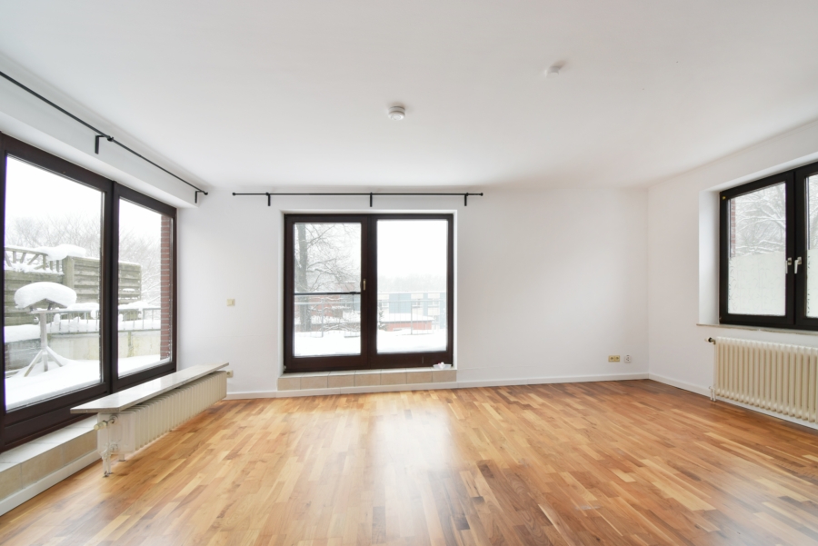 Das Wohnzimmer bildet das kommunikative Zentrum und punktet durch den praktischen Schnitt. Eine große Fensterfront versorgt den Raum mit ausreichend Tageslicht. Es bietet zudem einen direkten Zugang auf die große, sonnige Terrasse.